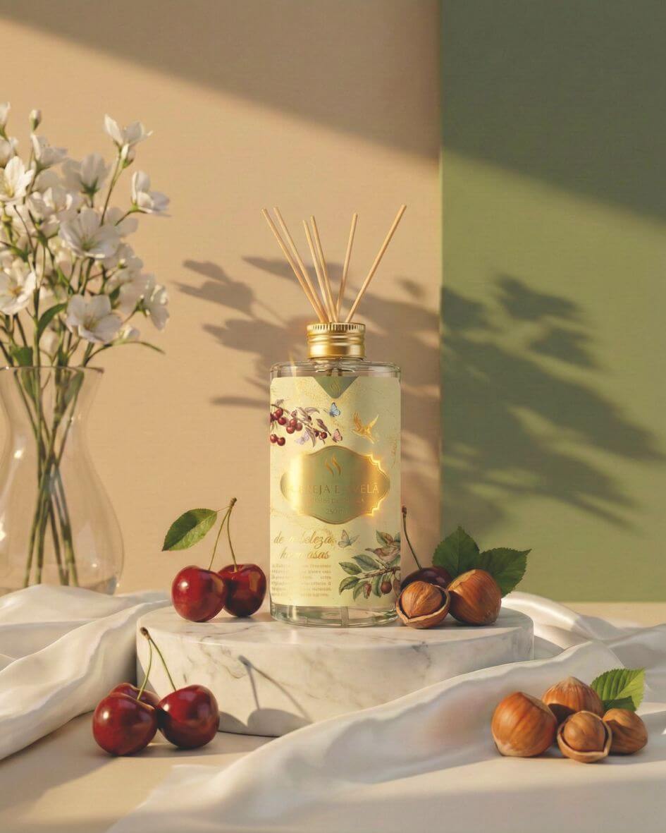 Cereja e Avelã — Gourmand envolvente que une a doçura da cereja com notas tostadas da avelã. Aconchegante sem ser enjoativo. Perfeito para salas e quartos nos meses frios.